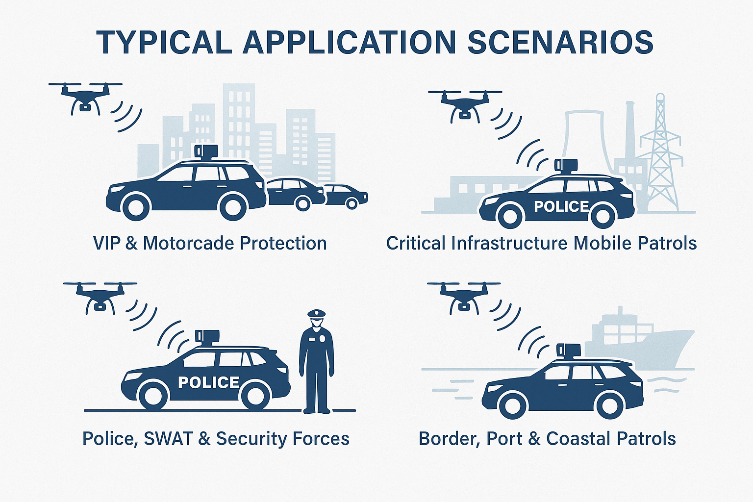 Our vehicle-mounted drone detection system strengthens vehicle-mounted situational awareness, including vehicular electronic countermeasures (ECM), drive-by drone detection, and a mobile RF suppression unit. It is powered by a kinetic-independent mobile countermeasure system with signal intelligence (SIGINT) on mobile platforms, auto-slew-to-cue integration for vehicles, terrain-adaptive RF scanning, and a mobile multi-sensor fusion engine.